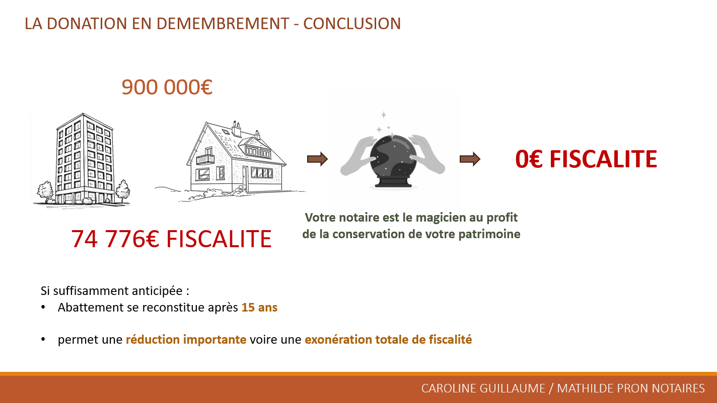 La donation en démembrement consiste à transmettre la nue-propriété des biens aux enfants tout en conservant l’usufruit pour les parents. L’usufruitier jouit du bien (droit d’usage et de revenus), tandis que le nu-propriétaire dispose de la substance (droit d’aliéner ou de transformer). La valeur de la nue-propriété varie selon l’âge de l’usufruitier : à 52 ans, elle équivaut à 50% de la pleine propriété ; à 49 ans, à 40%. Sur 900 000 €, cela donne 450 000 € ou 360 000 € de nue-propriété à donner (225 000 € ou 180 000 € par enfant). Après abattement de 100 000 €, les droits de donation se limitent à 3 194 € par enfant dans le premier cas, ou tombent à zéro dans le second. L’abattement se reconstitue après 15 ans, autorisant de nouvelles donations sans frais. Une anticipation précoce peut ainsi exonérer totalement la transmission, transformant 74 776 € de fiscalité en 0 €.