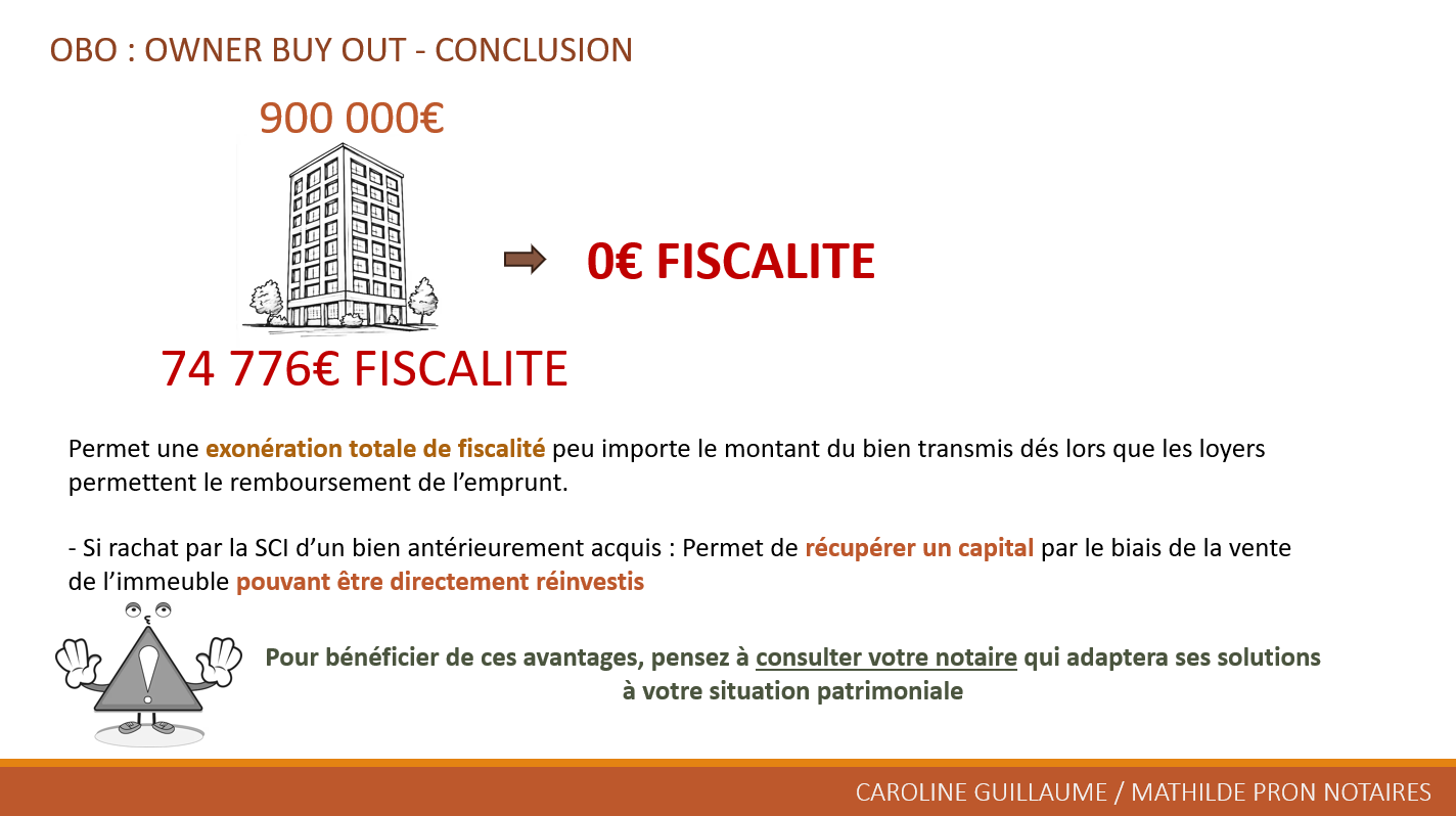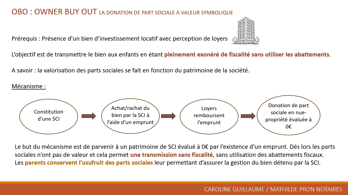 L’Owner Buy Out (OBO) cible spécifiquement les biens locatifs via une Société Civile Immobilière (SCI). Les parents créent la SCI, qui rachète l’immeuble par emprunt bancaire remboursé par les loyers perçus. Cela annule la valeur nette des parts sociales (patrimoine de la SCI à zéro en raison de la dette). La donation de la nue-propriété de ces parts, valorisées à 0 €, s’effectue sans fiscalité ni consommation d’abattements. Les parents conservent l’usufruit des parts, pilotant la gestion et les loyers. Ce montage assure une exonération totale indépendamment de la valeur du bien, récupère du capital via la vente initiale à la SCI (réinvestissable), et optimise les flux locatifs pour l’endettement. Idéal pour les patrimoines locatifs, il complète parfaitement le démembrement.