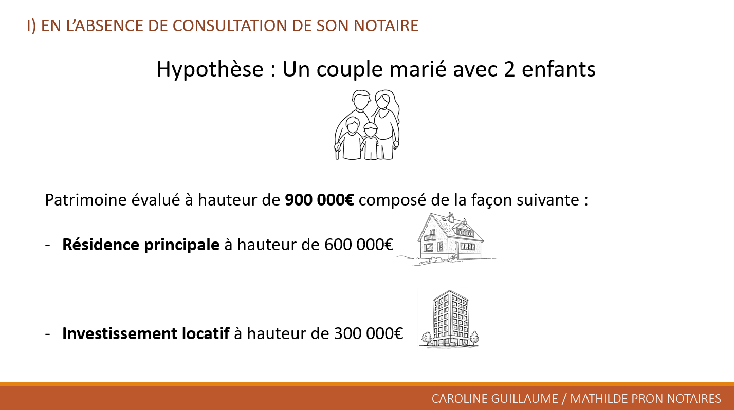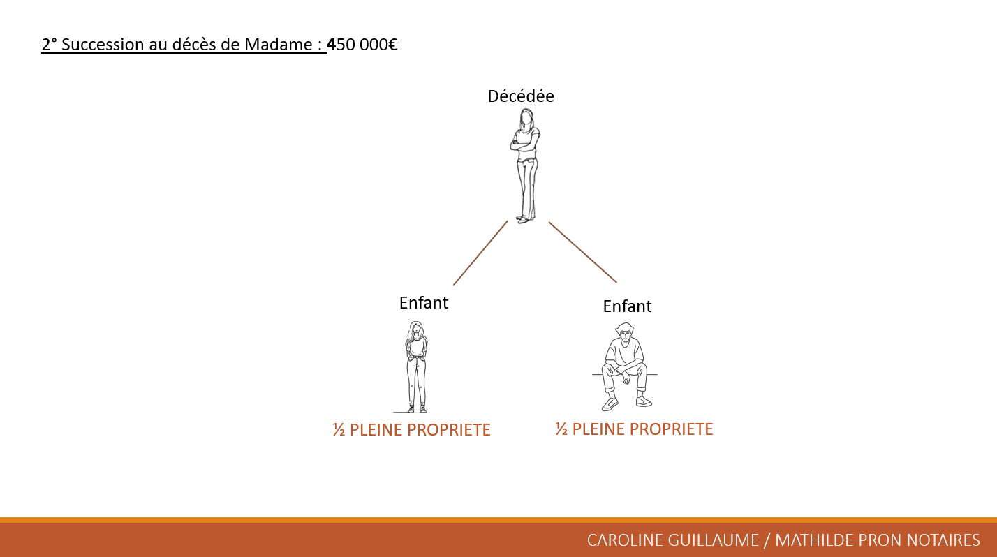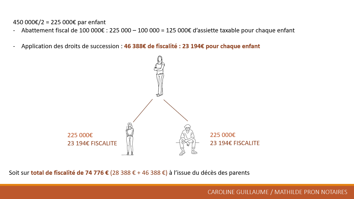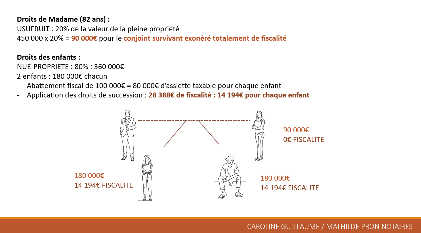 Sans anticipation, un couple marié avec deux enfants et un patrimoine immobilier de 900 000 € – composé d’une résidence principale à 600 000 € et d’un investissement locatif à 300 000 € – affronte une fiscalité lourde. Au décès du premier conjoint, âgé par exemple de 82 ans, la succession intègre 450 000 € en communauté légitime et 450 000 € en biens propres, pour un total de 900 000 €. Le conjoint survivant reçoit l’usufruit évalué à 20% de la pleine propriété (90 000 €), totalement exonéré. Les enfants se partagent la nue-propriété à 80% (360 000 € au total, soit 180 000 € chacun) ; après application de l’abattement de 100 000 € par parent et par enfant, l’assiette taxable tombe à 80 000 € par tête, générant environ 14 194 € de droits par enfant. Au second décès, la pleine propriété des 450 000 € (225 000 € par enfant) entraîne, après abattement, 23 194 € de droits chacun, pour un cumul de 74 776 € sur l’ensemble des successions.