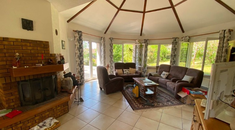 L’entrée mène à l’étage principal où la maison séduit par ses espaces de vie généreux comprenant une cuisine équipée, un salon / salle à manger convivial, ainsi qu’un grand séjour chaleureux agrémenté d’une cheminée avec insert, idéal pour créer une atmosphère cocooning..